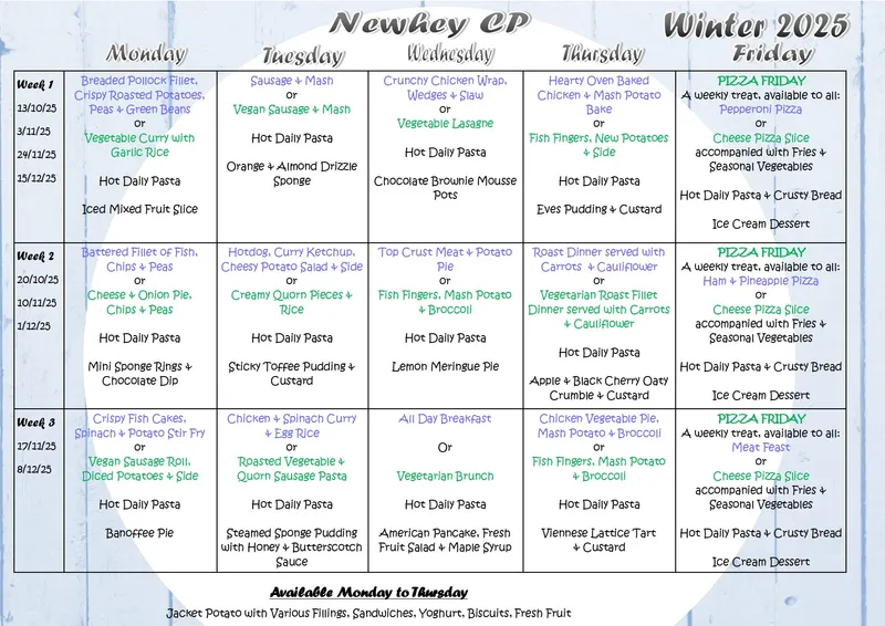 Our Lunch menus change termly but are sometimes subject to change due to delivery / supply issues.